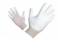 popis / nylonový úplet bez švov, dlaň a prsty pokryté tenkou vrstvou polyuretanu, pružná manžeta, biele |